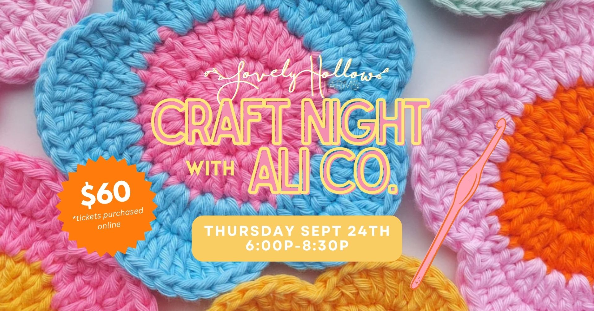 Whether you are a crochet enthusiast or looking to start this craft, join us at the farm on Thursday, September 24th, from 6:00 to 8:30 PM for evening of yarn and florals! Each crafter will select their yarn colors to learn an introductory project of a flower coaster before going to pick a bouquet of fresh flowers.